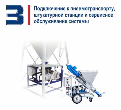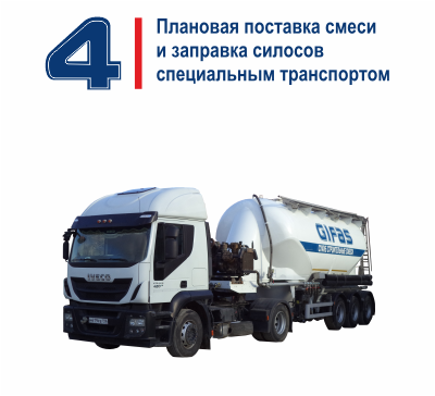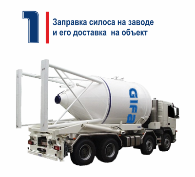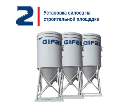 Силос GIFAS на стройплощадке используется как первый элемент механизации выполнения отделочных работ. На заводе в силос загружается сухая строительная смесь и с помощью установщика она транспортируется непосредственно на объект строительства. По занимаемой площади силос установка располагается на 4 квадратных метрах, то есть 18 кубометров смесей хранится на очень небольшой площади. К смесителю силоса подключается пневматическая транспортная система, которая обеспечивает транспортировку уже непосредственно продукта к штукатурной станции на этажи. В дальнейшем, по мере необходимости, силоса заправляются сухими смесями при помощи передвижного заправщика непосредственно на стройплощадке.