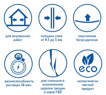 Высокоадгезионная сухая шпаклевочная смесь на основе гипсовых вяжущих, модифицирована специальными минеральными и химическими добавками, обеспечивающими высокую водоудерживающую способность, легкость приготовления, отличные технологические свойства для внутренних работ в сухих помещениях.