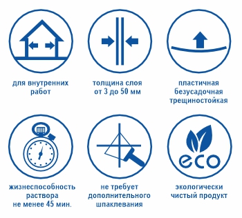 Предназначена для оштукатуривания ручным способом стен и потолков с любым типом поверхности (кирпичным, бетонным, каменным, цементно-известковым, штукатурки, ДСП и прочих) в помещениях с нормальным уровнем влажности под дальнейшую оклейку обоями, покраску валиком, декоративное оформление, облицовку керамической плиткой без дополнительного шпаклевания. Также возможно применение в помещениях с повышенной влажностью (кухнях и ванных комнатах) при условии обработки оштукатуренной поверхности гидроизоляционной грунтовкой перед дальнейшей отделкой. Все работы необходимо производить в соответствии с СП 71.13330.